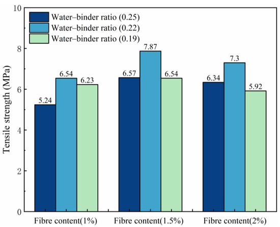The tensile strength change in trend is shown in Figure 5. With the reduction in the water–binder ratio, the tensile strength of ECC increases and then decreases. It also shows a water–binder ratio of 0.22 for reaching the maximum tensile strength and a P1.5W0.22 test group for reaching the maximum tensile strength of 7.87 MPa. Compared with the P1.5W0.19 test group, the growth rate of its tensile strength is 19.79%. This finding shows that when the water–adhesive ratio is 0.22, the sample matrix cross-section and fiber bonding force reach the optimal range, and the fibers are well dispersed to facilitate the preparation of air discharge. When the water–binder ratio is greater than 0.22, the internal compactness of the sample is reduced, the bonding resistance between the fiber and matrix is weakened, and the fiber is easily pulled out of the damaged interface, which leads to a reduction in tensile strength. When the water–binder ratio is less than 0.22, the sample is relatively dense, which is not conducive to fiber dispersion, and fiber agglomeration in the matrix easily results in the formation of bubbles. The sample develops rapidly along the internal pore space to generate cracks under tensile action, resulting in a reduction in tensile strength.