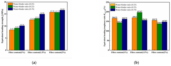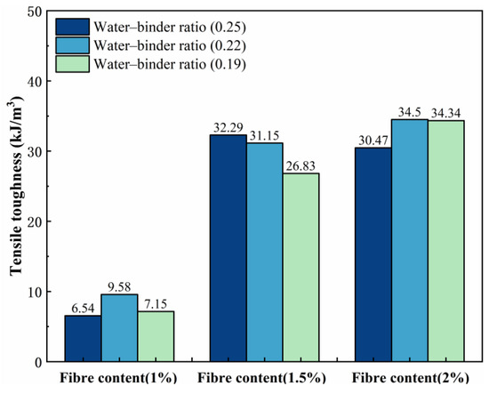 Figure 15 shows how the water–binder ratio and fiber content affect the tensile toughness. Interestingly, the fiber content has a large effect on the tensile toughness, whereas the water–binder ratio has a small effect on the tensile toughness, and the same goes for the change in toughness in the tensile test, in which the fiber content has a significant effect on the growth of tensile toughness of ECC. With the increase in fiber content, the overall tensile toughness of the specimen is an increasing trend. In 2.0% fiber content, the tensile toughness values have reached the maximum value. The deformation ability of a sample is affected by the damage to the cross-section of the connection bearing, and the fiber–matrix cross-section of the bond increases with decreasing water–binder ratio. As the water–binder ratio decreases, the damage to the cross-sections of the fiber shifts from half pull-outs to full pull-outs, causing the tensile toughness to initially increase and then decrease. As the fiber content increases, more fibers damage the cross-section of the sample, increasing its deformation capacity. As the fibers continue to increase, the bonds in the tensile interval shrink, leading to an uneven distribution of fibers and fiber entanglement, which accelerates the destruction of the sample and decreases its tensile toughness.