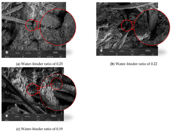 As shown in Figure 8b, when the water–binder ratio is 0.22, the pores produced by the air bubbles next to the fibers are obviously smaller at this time, and the matrix is observed to be denser in the rest of the range. As shown, the destruction of the cross-section of the fiber half connected to the matrix, the other half of the surface damage is serious, which indicates that when the water–binder ratio is reduced to 0.22. When the destruction of the cross-section of the fiber was half pulled-out, half pulled-off, it showed a good use of the fiber’s high modulus of elasticity, thus, maximizing the enhancement of tensile strength.