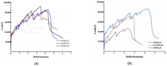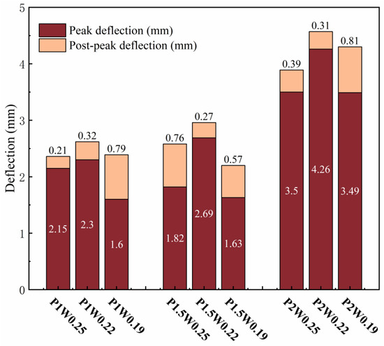 The variation rule of deflection is shown in Figure 11, where peak deflection is the difference between the deflection value corresponding to the extreme point on the load–deflection curve, and postpeak deflection is the deflection value corresponding to the section of the descending curve from the peak deflection to 0.85 times the peak load. The peak deflection increases and then decreases with decreasing water–glue ratio. In the P2W0.22 test group, the maximum peak deflection reached was 4.26 mm; compared with 3.49 mm in the P2W0.19 test group, where the growth rate of peak deflection was 22.06%. The peak deflection shows a general growth trend with increasing fiber content. The maximum peak deflection is reached in the P2W0.22 test group, and its growth rate is 85.22% compared with that of the P1W0.22 test group, which indicates that an increase in the fiber content has a significant effect on the growth of the peak deflection of the ECCs.