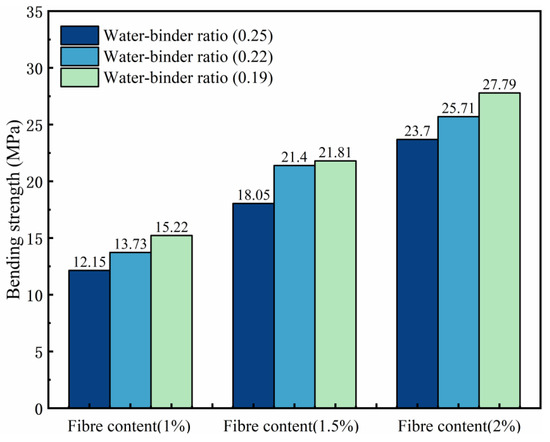 Figure 16 provides much information about how the water–binder ratio and fiber content points affect the bending strength. When the water–binder ratio is 0.19 at the lowest design factor and 2% at the highest design factor, the bending strength peaks. With increasing fiber content, the bending strength of the sample significantly increased, because in the bending process, the lower part of the sample cracked, and then gradually cracked from the lower end through to the entire damage section. In addition, when the fibers at both ends bridge, the fiber content continues to increase so that the fibers fill in the crack damage section, slowing down the development of cracks. More fibers participate in the damage process, resulting in multiseam cracking, and the bending strength continues to improve. When the W/B ratio is as low as 0.19, the highest design factor is 2%. As the water–binder ratio increases, the bending strength gradually decreases, because the sample is experiencing compression in the upper part of the bending process, a tensile state in the lower part, and a slow upward shift in the central axis during the destruction process. Once the lower part of the tensile damage develops, the fiber–matrix cross-section primarily plays the role of the bond, mirroring the tensile destruction mechanism of the tensile test.