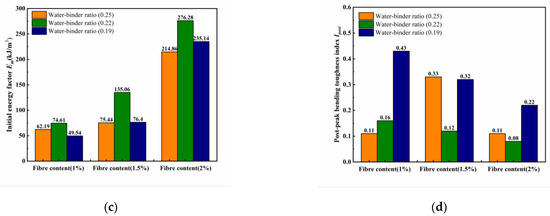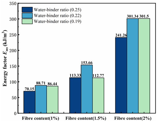 When the fiber content is unchanged, the pattern of the energy factor Ems is approximately the same. When the fiber content is 1%, with a decrease in the water–binder ratio, the Ems tends to increase and then decrease. When the fiber content is 1.5%, with a decrease in the water–binder ratio, the Ems also tends to increase and then decrease. When the fiber content is 2%, with a decrease in the water–binder ratio, the Ems continues to increase and reaches a maximum value of 301.50 kJ/m3 at P2W0.19, and the Ems of P2W0.22 is only 0.16 kJ/m3 lower than that of P2W0.19.