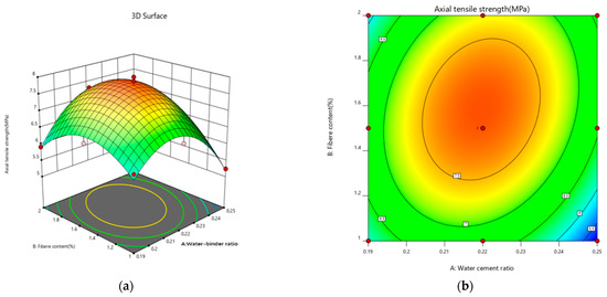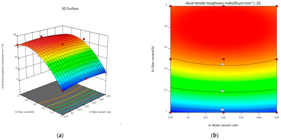 Figure 14 shows the 3D response surface and contours of the effects of the water–binder ratio and fiber content on the tensile strength. There is a distinct trend in the tensile strength response surface. The water–binder ratio and fiber content play a large role in the response surface. The tensile strength is lowest when the water–binder ratio is 0.25 and the fiber content is 1%. Reducing the water–binder ratio densifies the internal structure of the sample and strengthens the fiber–matrix cross-section bond, which becomes an important factor in tensile strength enhancement. As the water–binder ratio decreases and the fiber content increases, the tensile strength of a sample initially increases before it decreases. However, excessive fiber content leads to a decrease in the degree of hydride bonding between the fiber and matrix cross-sections, an excessively large fiber–matrix cross-section bond, and internal pore space damage, which accelerates the damage process and reduces the tensile strength of the sample.