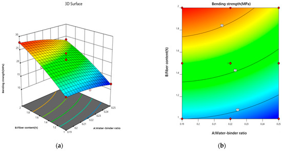 Interaction effect curves of different factors on the bending strength. (a) 3D response surface plot of the bending strength. (b) Bending strength contour map.