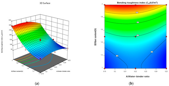 Interaction effect curves of different factors on the bending toughness. (a) 3D response surface plot of energy factor Ems. (b) Contour map of energy factor Ems.