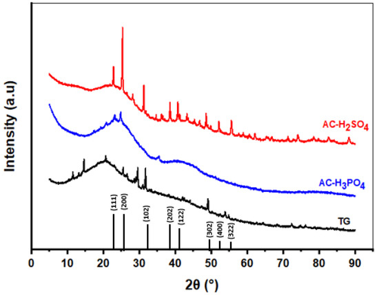 XRD patterns of AC-H3PO4, AC-H2SO4, and TG.