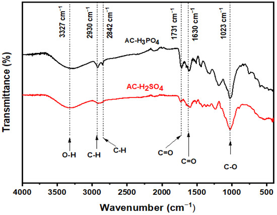 FTIR spectra of AC-H3PO4 and AC-H2SO4.