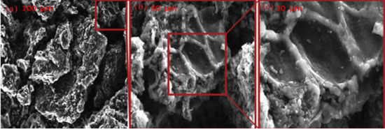 SEM micrographs of AC-H2SO4 sample at increasing magnifications ((a) 100 μm, (b) 30 μm, and (c) 10 μm).