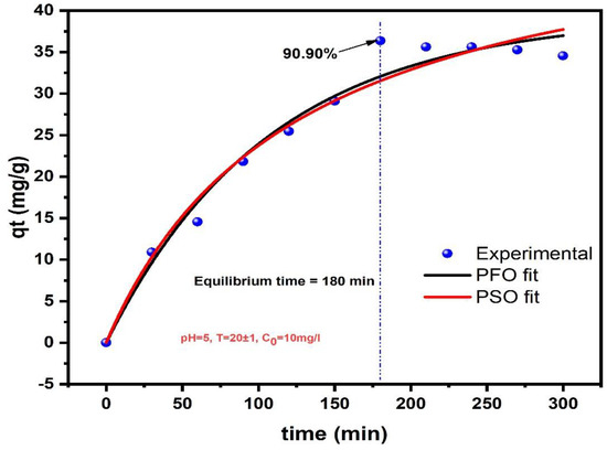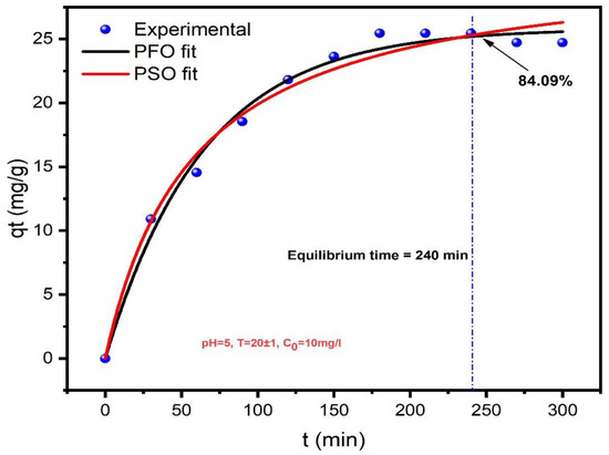 To further understand the adsorption kinetics, pseudo-first-order (PFO) and pseudo-second-order (PSO) models were applied to the experimental data. These kinetic models are expressed as follows: