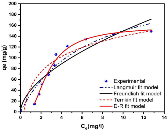 where: qm is the theoretical monolayer adsorption capacity (mg/g), A is the Temkin constant, b is the heat of adsorption (J), BD is the D-R constant related to the adsorption energy, and R is the universal gas constant (8.314 J/K·mol) [20].