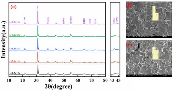 Figure 1a presents the XRD patterns of SPZTO ceramics with varying LF-glass contents. The results indicate that a pure perovskite phase is achieved, confirming the development of a complete solid solution. The broadening of the (200) peak is observed in the samples at the 2θ = 44~46° region (in other words, near the morphotropic phase boundary (MPB)), which is evidence of the coexistence of the tetragonal and rhombohedral phases. It is generally believed that piezoelectric ceramics have the optimum piezoelectric properties near the MPB. When the LF-glass contents increase, a distinct splitting of the (200)/(002) peaks can be observed, which implies that the coexistence of the rhombohedral-tetragonal phase near MPB tends to transform into the tetragonal-rich phase, which may enhance piezoelectric properties by flattening the free energy profile. When the material’s planar free energy is higher, it means that the material can more easily undergo changes in spontaneous polarization under the influence of an external electric field, which directly enhances the piezoelectric effect. Typically, the addition of glass flux cannot modify the crystal structure of the SPZTO ceramics, indicative of the occupation of the glass phase at the grain boundary. Figure 1b,c depict scanning electron microscope (SEM) images of fractured surfaces after sintering at 920 °C with different LF-glass. It is observed that as the grain size of the ceramics is basically unchanged with increasing LF-glass, grain size has a significant impact on the electrical performance of ceramics. Preliminary analysis suggests that the ceramic samples show optimal electrical performances at x = 2.0. This finding is supported by the results from X-ray diffraction (XRD) spectroscopy, which provide additional confirmation.