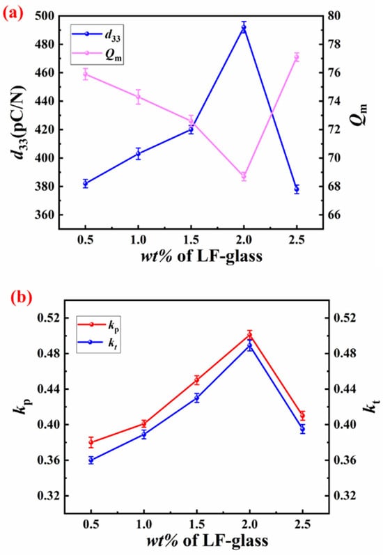 (a) The variation of d33 and Qm at room temperature; (b) the variation of kp and kt of SPZTO + x wt% LF-glass ceramics at room temperature.