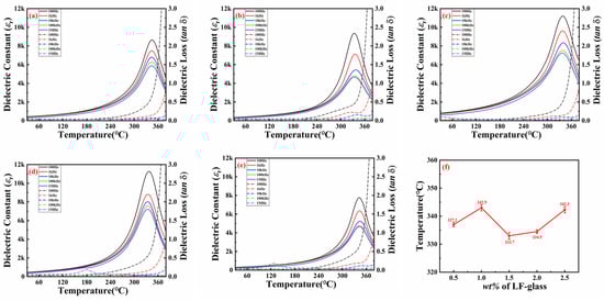 Dielectric–temperature spectra of the SPZTO + x wt% LF-glass ceramics: (a) x = 0.5; (b) x = 1.0; (c) x = 1.5; (d) x = 2.0; (e) x = 2.5; (f) the variation of Tc under different LF-glass content.