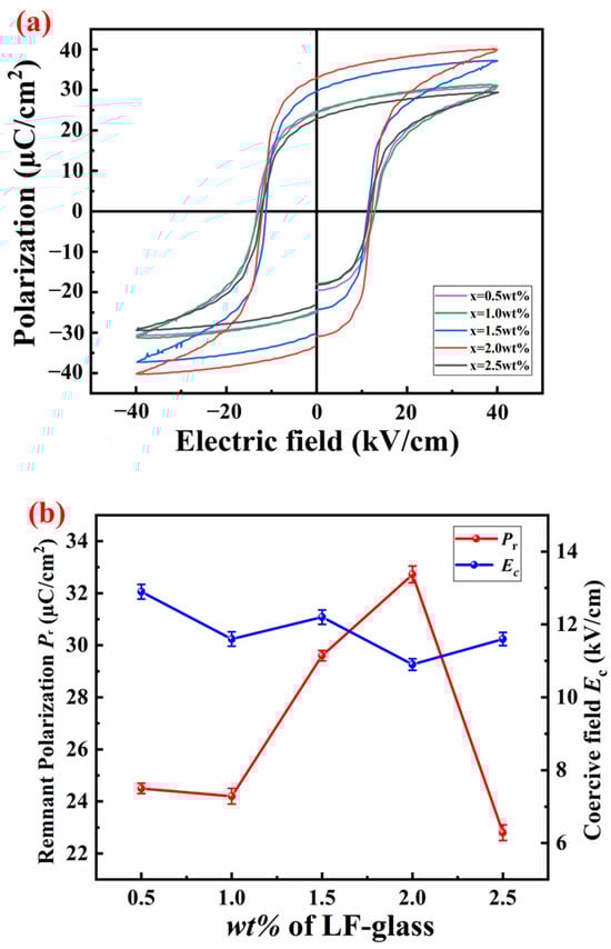 (a) P-E hysteresis loops of the SPZTO + x wt% LF-glass ceramics at room temperature; (b) the variation of Pr and Ec under different LF-glass content at room temperature.