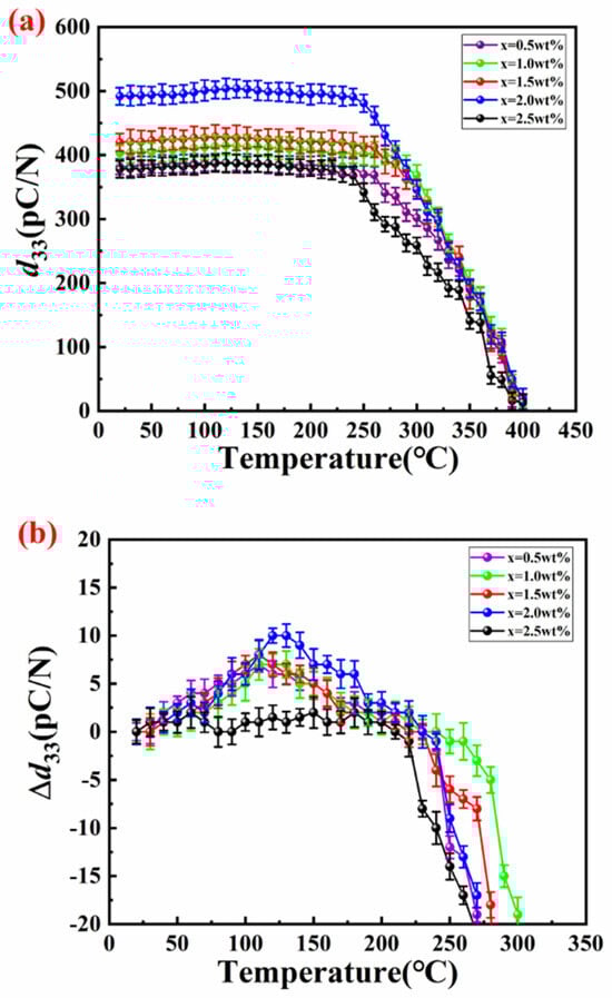(a) The in situ d33–temperature dependence of the SPZTO at room temperature + x wt% LF-glass ceramics; (b) the Δd33–temperature dependence of Sm0.01Pb0.99(Zr0.54Ti0.46)O3 + x wt% LF-glass ceramics at room temperature.
