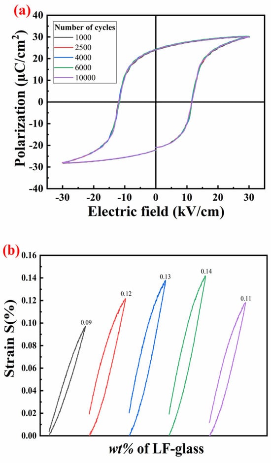 Cyclic and strain test diagrams of the SPZTO + x wt% LF-glass ceramics at room temperature; (a) the cyclic P-E curve of LF-glass = 2 wt% under 30 kV/cm; (b) S-E curves of ceramics under 30 kV/cm at room temperature.