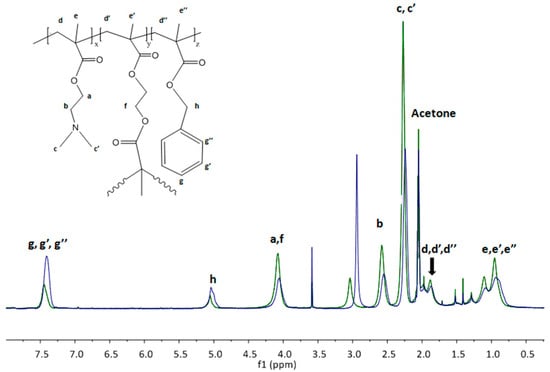 1H-NMR spectra of HB1 (green) and HB2 (blue) hyperbranched copolymers (the solvent is deuterated acetone (CD3)2CO, and the letters indicate the corresponding hydrogens in the chemical structure).