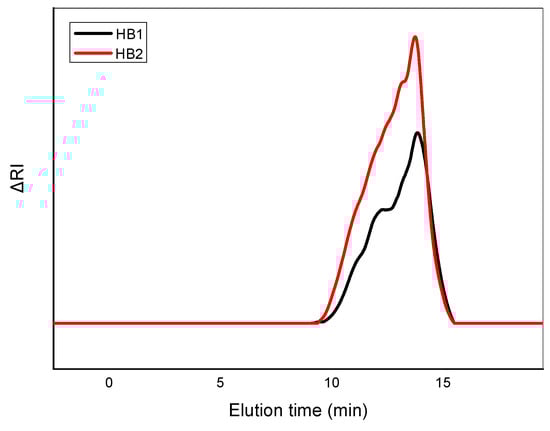 SEC chromatogram for HB1 and HB2 hyperbranched copolymers.