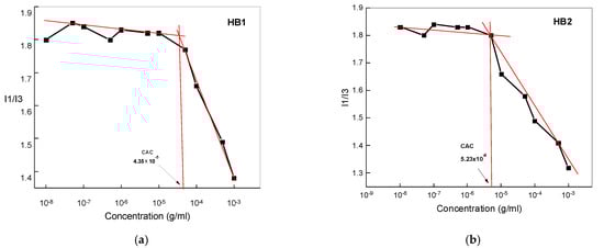 Critical aggregation concentration (CAC) determination for HB1 (a) and HB2 (b) at pH 7.