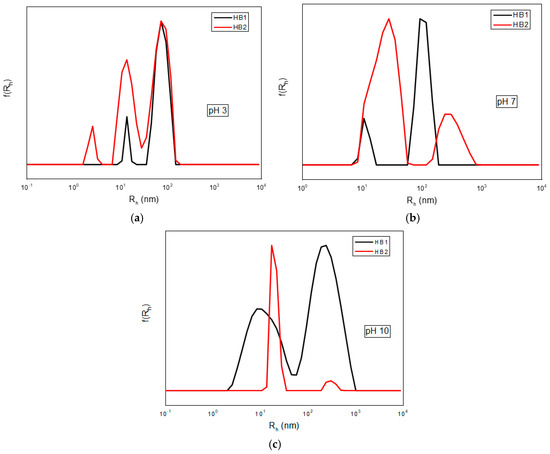 Size distributions from DLS for the HB1 and HB2 hyperbranched copolymer solutions at (a) pH 3, (b) pH 7, and (c) pH 10.