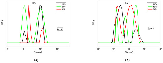 DLS analysis was conducted to investigate the self-assembly behavior of P(DMAEMA-co-BzMA) hyperbranched copolymers, focusing on the determination of the hydrodynamic radius (Rh) and size polydispersity index (PDI). The scattering intensity of light in DLS measurements is directly related to the mass of the formed nanoparticles, which provides information about the aggregation states of the polymers under varying conditions. Specifically, pH and temperature changes were analyzed to observe their impact on the self-organization of the copolymers. The size distributions of aggregates for the HB1 and HB2 hyperbranched copolymers across three different pH values are illustrated in Figure 4. For the HB1 copolymer, the presence of two populations with distinct sizes is observed (also for HB2, see below). This should be related to the inherent molar mass and compositional and structural heterogeneity of the copolymers as it can also be discerned by SEC analysis (Figure 2). The heterogeneity in macromolecular chain mass, monomer composition, and branching mode of these amphiphilic copolymers most probably leads to the formation of diverse aggregates with different structural characteristics in water which may be observed at different pHs. At neutral pH, the amino groups of PDMAEMA are partially protonated. As the pH decreases, these amino groups become fully protonated. Consequently, repulsive forces are generated within the polymer chains, which break apart the aggregates, leading to a reduction in the mass and size of the supramolecular structures formed in solution. Conversely, at pH 10, the amino groups of PDMAEMA are deprotonated, resulting in a more hydrophobic character for the copolymer system. The chains cluster more and this leads to the formation of larger aggregates and, consequently, an increase in hydrodynamic radius. For the HB2 copolymer, two populations are also observed at neutral pH, but with notable distinctions. The main population shows a broader size distribution and a smaller hydrodynamic radius compared to HB1, while the minor population appears to form larger aggregates. This behavior is likely due to the composition of HB2, which contains a higher proportion of BzMA. The hydrophobic nature of BzMA tends to cause aggregation, leading to a wide range of particle sizes in the solution and the formation of larger aggregates. At pH = 3, the large aggregates break down due to the protonation of DMAEMA amino groups, and also the presence of single chains (Rh~3 nm) is observed, because of the increased hydrophilicity of the system.At pH=10, a decrease in the hydrodynamic radius of HB2 is noted, which might initially seem unexpected. However, the parallel significant increase in scattering intensity suggests the presence of highly compact aggregates. This is anticipated due to the deprotonation of DMAEMA in combination with the hydrophobic nature of BzMA.