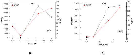 Ionic strength dependence plots for (a) HB1 and (b) HB2 copolymers (polymer concentration 10−3 g/mL, at pH = 7 and at a temperature of 25 °C).