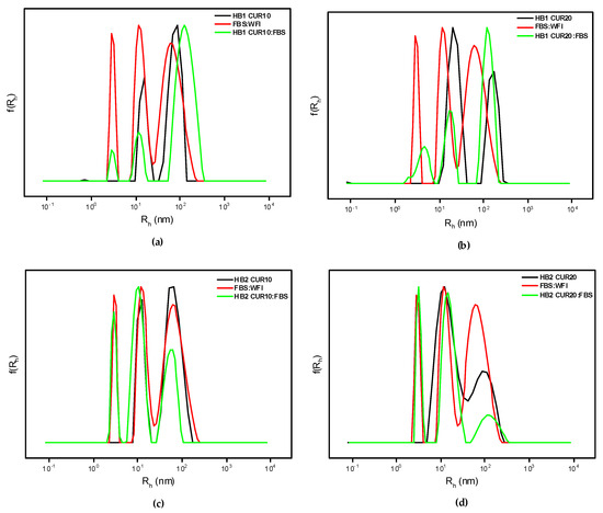 Subsequently, the interactions of CUR-loaded nanoparticles with FBS proteins were investigated to assess their potential biomedical application and compatibility with blood components. FBS served as a blood-mimicking medium in the DLS measurements. These measurements assessed nanoparticle characteristics after introducing CUR-loaded nanoparticles to the FBS/WFI solution, as detailed in Section 2.6. Fetal bovine serum (FBS) typically displays three distinct peaks in size distributions from CONTIN analysis, as illustrated in Figure 7. The DLS data shown in this figure indicate that the CUR-loaded nanoparticles do not experience any further aggregation of the previously formed mixed copolymer–drug particles after being combined with FBS/WFI media. This suggests that at a 1:1 ratio of FBS to WFI, the mixed nanostructures do not interact with the components of FBS, allowing the populations of the loaded aggregates to remain unchanged. Therefore, the CUR-loaded copolymer aggregates demonstrate significant stability in the presence of serum proteins. This observation is particularly interesting, as FBS contains albumin, a negatively charged protein, which would be expected to interact with the cationic groups of the polymers. The fact that this interaction does not occur is likely attributed to the structure of the polymer aggregates, which hinders such interactions.