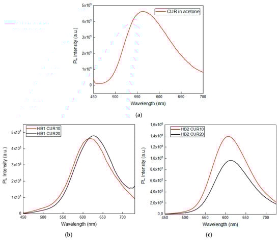 Curcumin is widely recognized for its strong intrinsic fluorescence, making it valuable for bioimaging applications, a property that has led to extensive studies on curcumin’s optical properties [21]. Curcumin exhibits limited water solubility (4.2 μg/mL) [22], which improves drastically when encapsulated in polymeric structures. Moreover, the loaded polymeric aggregates exhibit significant fluorescence after CUR entrapment. Hence, fluorescence studies of CUR-loaded hyperbranched copolymers were performed at pH 7 using UV–Vis and fluorescence techniques, to determine the optical properties of curcumin after its entrapment into the polymeric aggregates. UV–Vis studies are depicted in Figure S4. According to the literature, curcumin in aprotic solvents such as acetone gives a fluorescent signal at 494 to 538 nm [23]. The peak maximum of curcumin in Figure 8a was measured at 562 nm. However, in the studied systems, curcumin shows a signal at higher wavelengths, between 607 and 619 nm (Figure 8b,c). This shift is attributed to the aggregation of curcumin molecules within the hydrophobic regions of the copolymer aggregates [24]. This explains the signal at higher wavelengths observed in HB2 compared to HB1, as HB2 contains a greater amount of BzMA, and therefore has more hydrophobic regions. Moreover, the phenyl rings of BzMA are expected to interact favorably with curcumin molecules, promoting its encapsulation and probably a different way of its aggregation within the copolymer nanostructures.