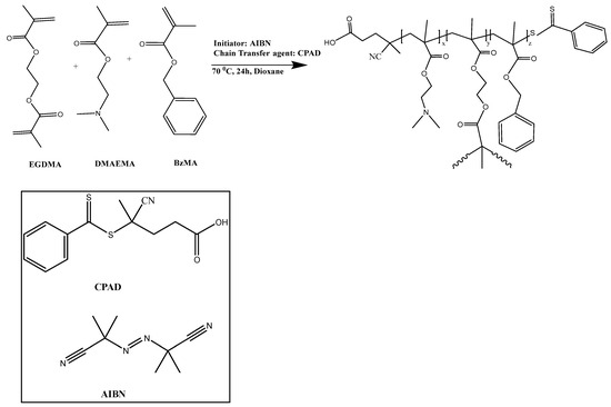 The monomers 2-(dimethylamino)ethyl methacrylate (DMAEMA) and benzyl methacrylate (BzMA), and the branching agent ethylene glycol dimethacrylate (EGDMA, 98%, difunctional monomer), were obtained from Sigma-Aldrich (Athens, Greece). DMAEMA, EGDMA, and BzMA were purified before polymerization by passing them through a column packed with inhibitor-removing resin (311,332, Sigma-Aldrich). The radical initiator, 2,2-azobis(isobutyronitrile) (AIBN), was recrystallized from methanol before use. The solvent, 1,4-dioxane (≥99.8% pure, Sigma-Aldrich), was dried using molecular sieves, while acetone, n-hexane (≥97%, Aldrich), chain transfer agent, 4-cyano-4-(phenylcarbonothioylthio) pentanoic acid (CPAD), fetal bovine serum (FBS), and other reagents were used as received from Sigma-Aldrich.