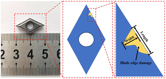 Physical drawing of the tool and schematic diagram of blade edge damage measurement.