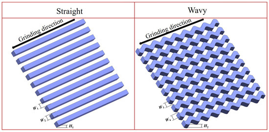 In this study, two distinct laser-textured patterns were employed, as illustrated in Figure 2. The pattern on the left comprises straight texture, whereas the one on the right features wavy texture. These lines align with the wheel feed direction. The dimensions of the straight texture are shown in Table 3, and Table 4 displays the specific dimensions of the wavy-textured pattern. It has been shown that the synergistic interaction between laser-machined micro- and nano-textured structures and grinding fluids has a good heat dissipation effect. Additionally, the concave texture serves as a reservoir for the grinding fluid, offering a buffering effect. Simultaneously, it establishes a pathway for the removal of abrasive chips [25].