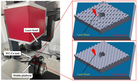 Laser processing is an advanced non-contact processing technology that utilizes the thermal effect of a high-energy-density laser beam on the surface of the workpiece to achieve precise processing of the material [26]. In this study, an ultrafast picosecond pulsed laser system model BC-2900 (Zhongshan Initialase Technologies Co., Ltd., Zhongshan, China) was used to etch the surface of a WC–Co carbide tool, including straight and wavy textures. The laser processing parameters are shown in Table 5 The experimental setup for laser processing, depicted in Figure 3, features an ultrafast picosecond pulsed laser with an energy distribution adhering to the Gaussian distribution law. The Gaussian laser beam is modulated by a system of mirrors and transformed into a flat-top laser beam. During texturing, this flat-top laser beam exhibits the advantages of uniform top energy distribution and clear edge characteristics, allowing for more precise cutting operations, resulting in sharper and more accurate edges. Following the laser texturing procedure, the tools underwent ultrasonic cleaning in anhydrous ethanol for a duration of 10 min. Subsequently, the cleansed tools were blow-dried using a nitrogen gas gun. Finally, in order to observe the microstructure, we carried out a comprehensive surface morphology observation with the help of a laser confocal microscope to analyze the cross-section height profile of the laser-textured WC–Co carbide tools.