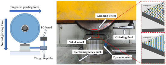 By comparing conventional grinding with laser-assisted grinding on WC–Co carbide tools, we found that, under the same working conditions, the maximum reduction in normal grinding force of the wavy-textured tool reached 53% and the maximum reduction in tangential grinding force was 51.2%. The reduction in grinding force is mainly attributed to the reduction in material hardness after laser ablation and the design of the wavy texture, which helps in chip evacuation, thus reducing wear and friction during the grinding process.