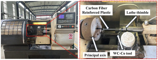 The cutting experiments were carried out on a CAK40100v1 CNC horizontal lathe (Shenyang Diyi Machine Tool Manufacturing Co., Ltd., Shenyang, China). The machining setup is shown in Figure 6. During machining, the CFRP bar is clamped in a customized fixture which is connected to the machine spindle. Turning on CFRP rods was carried out using ground WC–Co carbide tools, and the experimental conditions for turning are shown in Table 7. The cutting was carried out under dry conditions without using any cutting fluid. The turned CFRP rods were observed using a super-depth-of-field microscope (VHX-5000, KEYENCE, Osaka, Japan) to compare the effect of carbide tools with different edge defects on the surface of CFRP rods. The tool wear after turning was also observed.