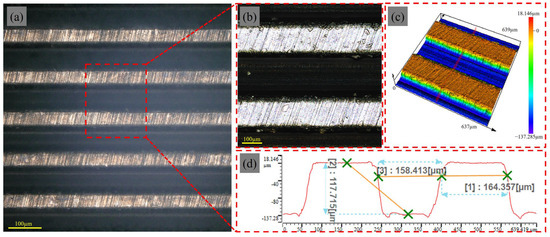 Surface morphology of straight texture after laser texturing: (a) overall surface morphology; (b) local surface morphology; (c) 3D surface morphology; (d) cross-section profile curve.