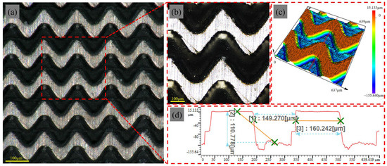 Figure 7a illustrates the overall surface morphology of the straight texture, where the tool surface appears to have a regular straight texture due to laser ablation. Figure 7b,c depicts localized surface features and 3D height maps of this straight texture. The flat-topped picosecond laser beam produced sharp laser boundaries that clearly delineated the treated and untreated areas. It is worth noting that the ultrashort pulse duration of the picosecond laser allows for rapid vaporization of the tool material, thus minimizing thermal damage to the tool [27]. Figure 7d illustrates a cross-sectional profile of the straight texture. The width of the grooves of a single straight texture unit is 158.413 µm, the spacing is 164.357 µm, and the depth is 117.715 µm. Due to the scanning path of the laser, the beam spends more time in the front and rear areas of the bottom. These areas are exposed to the laser for a longer period of time, resulting in more heat build-up, which produces greater thermal expansion and dimensional changes. This thermal effect results in a slight deviation from the theoretical dimensions, but the deviation is still within 20 microns.