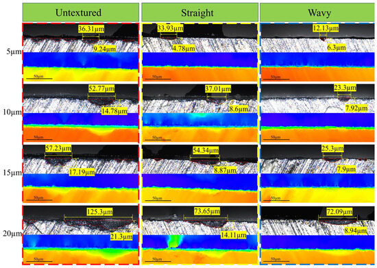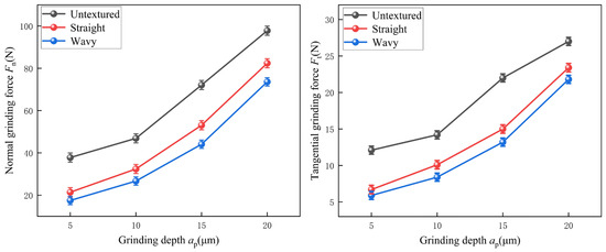 Grinding force is a crucial consideration in the grinding process. It directly affects the degree of tool deformation during machining, which in turn relates to machining accuracy and tool quality [28]. Figure 9 clearly shows the comparison of tangential and normal grinding forces for the untextured, straight, and wavy-textured configurations at different depths of grinding. Comparing the grinding forces of the straight- and wavy-textured configurations at different grinding depths, we observe that there are slight differences between the two. Specifically, the maximum difference in normal grinding force between straight and wavy texture is 9 N, and the minimum difference is 3.9 N. The maximum difference in tangential grinding force is 1.8 N, and the minimum difference is 0.8 N. Comparing these two types of grinding forces, the wavy texture shows a superior performance to the straight texture. This is mainly due to the tiny raised and depressed structures formed by the wavy texture on the tool surface. These structures act as heat dispersal points and stress buffers during the grinding process, effectively reducing the concentration of heat and stress generated by grinding and thus reducing the grinding force. Further comparing the structured tools (including straight- and wavy-textured) with the untextured tools, we find that there is a significant difference in the grinding forces between the two. Compared to the untextured tools, the straight texture reduced the normal grinding force by 15.7% to 43.4% and the tangential grinding force by 13.3% to 44.6%. The wavy texture, on the other hand, performed even better in terms of grinding force reduction, with reductions in normal grinding forces ranging from 24.7% to 53.7% and tangential grinding forces ranging from 19.3% to 51.2% compared to the untextured tools. There are three main reasons for these significant differences. Firstly, the structured design of the tool surface reduces the actual contact area between the tool and the grinding wheel, which in turn reduces the tangential and normal grinding forces during the grinding process. Secondly, these microstructures can effectively spread the heat and stress generated during the grinding process over a larger area, avoiding excessive concentration of heat and stress at a single point and further reducing the grinding force. Finally, the textured tool is able to store cutting fluid [29], which enhances the role of the cutting fluid in the grinding process and helps to reduce the coefficient of friction between the tool and the grinding wheel, thus further reducing the grinding force. As the grinding depth deepens, the normal grinding force rises accordingly at the same feed rate and wheel speed. At the same time, the chip thickness of individual grits increases, leading to an increase in their material removal capacity and force, and therefore an increase in the overall grinding force.