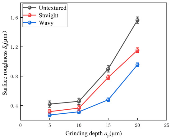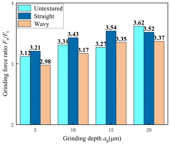 Figure 10 reveals the differences in the grinding force ratios between the untextured, straight, and wavy-textured tools at different depths of grinding. The grinding force ratios between the three profiles show an overall increasing trend. The grinding force ratios of the untextured tools ranged from 3.12 to 3.62, whereas the grinding force ratios of the wavy-textured tools were in the range of 2.98 to 3.37. This difference may be due to the wavy texture enhancing the flow of coolant within the grinding zone, so that the coolant penetrates the grinding zone more efficiently, which reduces the grinding temperature as well as the friction and heat build-up during the process, which ultimately leads to a decrease in the grinding force ratio. However, the grinding force ratio is higher for straight-textured tools than for untextured tools. Figure 7 shows that the grinding forces in the tangential and normal directions are lower for the straight-textured tool than for the untextured tool. The reason for this can be deduced from the fact that under the influence of the straight texture, the normal force is reduced to a lesser extent as compared to the tangential force. This is because the straight textures are aligned primarily along the direction of grinding (tangential), so they primarily change the contact area in the tangential direction. In contrast, the contact area perpendicular to the grinding direction (normal) is less affected by the straight texture.