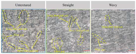As a two-phase composite material, tungsten–cobalt alloy was observed to undergo an increase in the depth and number of scratches with the gradual increase in the depth of grinding, while the mixing area between the bonded and tungsten phases was gradually enlarged, with a corresponding increase in the amount of abrasive chip attachment. However, the surface morphology of the textured tool exhibited a superior state compared to the untextured tool. Specifically, the straight-textured tool reduced the surface roughness by up to 26.2% compared to the untextured tool, while the wavy-textured tool performed better, reducing the surface roughness by up to 38.9% compared to the untextured tool.