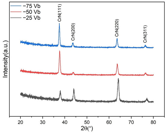 Figure 2 depicts the low-incidence-angle X-ray diffraction patterns of CrSiN films deposited under a variety of coating conditions. It is anticipated that the CrSiN films will comprise crystalline CrN and amorphous Si3N4. As illustrated in the results, the primary phases identified in all films were found to be cubic CrN, exhibiting diffraction peaks corresponding to the (111), (200), (220), and (311) planes. The lattice constants of the sputtered CrN peaks were calculated to be 0.4100, 0.4128, and 0.4136 nm for −25 V, −50 V, and −75 V CrSiN films, respectively. These values are all slightly lower than the standard lattice constant of 0.4140 nm for cubic CrN, as reported in [ICSD 00-011-0065]. This suggests that the tensile stress within the film increases with an increase in bias voltage. Conversely, no peaks corresponding to silicon-containing compounds (e.g., CrSi2, Si, or Si3N4) were identified, indicating that Si3N4 is likely present in an amorphous form [34]. Moreover, the films that were grown under conditions of weak ion irradiation at a substrate bias voltage of −25 V exhibited a predominant orientation of (220), with smaller fractions of (111), (200), and (311) planes. However, as the bias voltage increased to −50 V and −75 V, the films exhibited a transition to a dominant (111) texture. This transformation is attributed to the reconstruction of the crystal plane, which is driven by the elevated energy of the adatom, thereby facilitating the minimization of free energy. In accordance with the standard film growth model, the preferential growth of grains on low-energy surfaces is driven by the objective of minimizing surface energy. At a substrate bias voltage of −25 V, ions impart momentum to the coating surface, thereby promoting diffusion and adatom rearrangement, which in turn leads to significant strain accumulation. To reduce this strain, adatom alignment occurs on less stressed planes, such as the (220) plane in face-centered cubic (FCC) structures, due to its lower packing density, which generates less strain compared to denser planes [36]. However, at higher bias voltages of −50 V and −75 V, the preferred orientation shifts abruptly from the (220) plane to the (111) plane. This transition is attributed to the higher energy and diffusion rate of adatoms, which facilitate their rearrangement onto planes that minimize the overall surface energy, with the (111) plane being favored due to its lowest surface energy in FCC structures [49].