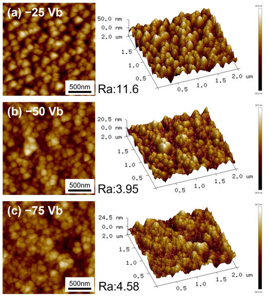 Figure 3 depicts the AFM surface morphologies and three-dimensional topographic images of CrSiN films under varying substrate bias voltages, accompanied by the corresponding surface roughness (Ra) values. At the lowest applied bias voltage of −25 V, the three-dimensional topographic images demonstrate the presence of relatively large grains and a surface that is characterized by a high degree of roughness. As the bias voltage increases to −50 V, the Ra value decreases, which can be attributed to enhanced atomic mobility and ion bombardment caused by the higher ion energy, leading to a reduction in surface particle size [50]. Furthermore, the reduction in roughness is associated with a reduction in surface defects and an improvement in film densification [51], which is consistent with the SEM surface morphology observations in Figure 1. However, when the bias voltage is increased to −75 V, the Ra value exhibits a slight increase compared to −50 V CrSiN films. This is attributed to more intense ion bombardment at higher bias voltages, which induces surface defects and results in greater surface undulations [43].