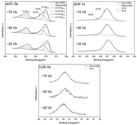 The chemical compositions of CrSiN films deposited at varying substrate bias voltages were analyzed using WDS, and the results are presented in Table 2. The data indicate that the Si/(Cr + Si) ratio consistently ranges from 0.10 to 0.11, while the nitrogen content remains between 45.56 and 46.6 at%. These findings indicate that varying the substrate bias voltage has a negligible effect on the elemental composition of the films. The presence of oxygen in the films is attributed to residual oxygen involved in the sputtering process or remaining gases within the spectrometer chamber. To gain further insight into the chemical states of CrSiN films under varying substrate bias voltages, high-resolution XPS analysis was conducted to investigate the near-surface characteristics. A Gaussian model was employed to fit all XPS spectra, thereby facilitating the acquisition of detailed chemical bonding information. The spectra were calibrated using the C 1s peak at 284.4 eV, as previously reported [52]. As illustrated in Figure 4a, the Cr 2p spectra of all films exhibit two discernible components, which are attributed to the Cr-N and Cr-O bonds, respectively. The lower binding energy peaks at 574.73 eV, 575.13 eV, and 575.08 eV, observed for substrate bias voltages of −25 V, −50 V, and −75 V, respectively, are associated with Cr-N bonds. These binding energy values are consistent with those reported in previous studies (574.5~575.3 eV) [53,54,55]. The higher energy value at 576.73~576.93 eV corresponds to Cr-O bonds, indicating that some Cr atoms are bonded to oxygen on the film surface [53]. As illustrated in Figure 4b, the N 1s spectra exhibit a broad peak at 396.83~397.08 eV. This peak can be deconvoluted into two components: a dominant peak corresponding to Cr-N bonds (396.73~397.03 eV) and a weaker peak attributable to Si3N4 bonds (397.88~398.08 eV) [55]. These findings substantiate the formation of both Cr-N and Si-N bonds in the films. Figure 4c depicts the Si 2p spectra for films deposited at varying substrate bias voltages. The fitted curves indicate the presence of exclusively Si-N bonds, with no discernible evidence of other potential bonds such as Si-Si or Si-O [54,56,57]. This finding strongly supports the conclusion that silicon exists predominantly in the form of a Si3N4 compound. Although XRD analysis is inherently limited in its ability to identify amorphous phases, the high-resolution XPS spectra provide definitive confirmation of the Si3N4 bonds, thereby substantiating its incorporation within the film matrix.
