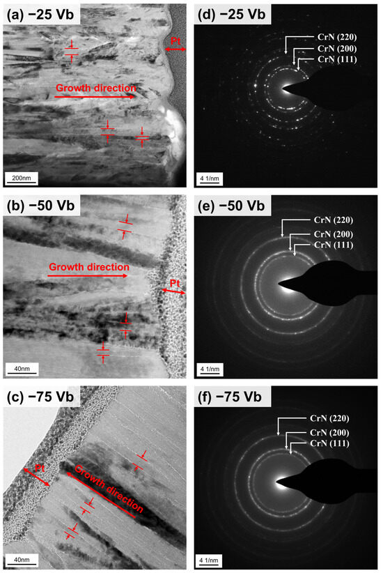 Figure 5a–c depicts cross-sectional TEM images of sputtered CrSiN films, where a protective Pt layer was deposited on top of the films. These images reveal dense columnar grain structures within the CrSiN films. As depicted in Figure 5, the columnar grains grow vertically relative to the substrate surface, as marked by the red arrow. Based on the TEM images, the average columnar grain widths for films deposited at substrate bias voltages of −25 V, −50 V, and −75 V are measured at 29 ± 4 nm, 9 ± 1 nm, and 8 ± 2 nm, respectively. Furthermore, the surface of the film deposited at −25 V displays a notable degree of roughness. The corresponding selected area diffraction (SAD) patterns for the three coatings are also presented in Figure 5d–f. In the SAD patterns of the CrSiN coating deposited at −25 V, discrete diffraction reflections are observed. In contrast, near-continuous segments of diffraction rings are present in the SAD patterns of the coatings deposited at −50 V and −75 V. This behavior suggests that the smaller columnar grain sizes and more crystal orientations in the −50 V and −75 V CrSiN coatings.