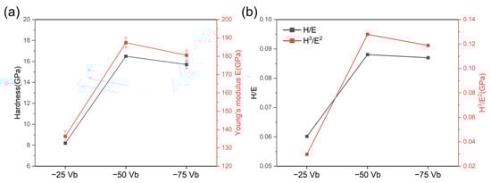 (a) Hardness (H) and elastic modulus (E), and (b) H/E and H3/E2 values of CrSiN films deposited under different substrate bias voltages measured by Nano-indenter.