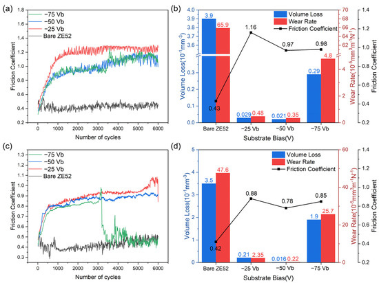 Shows the results of the pin-on-disk test: (a,c) friction coefficient as a function of the number of cycles, and (b,d) plots for volume loss, wear rate, and friction coefficient of CrSiN films deposited under different substrate bias voltages. The tests were conducted with a load force of (a,b) 2 N and (c,d) 4 N.