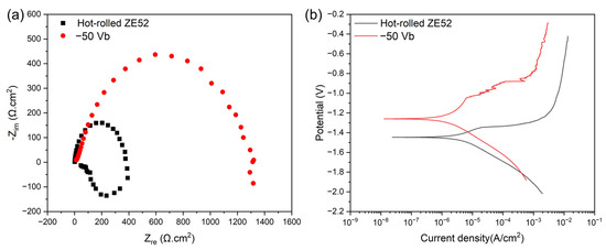 Figure 10 depicts the electrochemical impedance spectroscopy (EIS) and potentiodynamic polarization (PDP) measurements for the bare ZE52 and −50 V CrSiN films in a 3.5 wt% NaCl aqueous solution at room temperature. The polarization impedance (Rp), corrosion potential (Ecorr), and corrosion current density (Icorr) were obtained through the Tafel extrapolation method, with the corresponding quantitative values provided in Table 6. As illustrated in Figure 10a, the EIS data, presented as a Nyquist plot, allow for the evaluation of the corrosion properties of the samples by comparing the diameters of the semicircles in the plot [64]. The larger the diameter, the greater the corrosion resistance of the samples. The results demonstrate that depositing the CrSiN films on the ZE52 substrate under a bias voltage of −50 V markedly enhances corrosion resistance, attaining values approximately three times those of the bare ZE52 substrate. Figure 10b illustrates that the CrSiN films deposited under a bias voltage of −50 V exhibit a lower corrosion current density in comparison to the bare ZE52 substrate, with values of 1.2255 × 10−6 (A/cm2) and 3.1324 × 10−6 (A/cm2), respectively. A reduction in corrosion current density is indicative of diminished charge transfer, which consequently enhances corrosion resistance [65]. This finding is in accordance with the results obtained from the EIS analysis. In conclusion, the deposition of the CrSiN films under a substrate bias voltage of −50 V on the ZE52 substrate effectively improves the overall corrosion resistance.