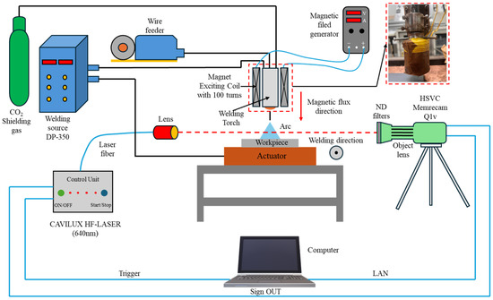 This experiment compared metal transfer behavior and spatter formation in CO2 arc welding with and without the application of LMF. Observations were carried out using a HSVC (Memrecam Q1v, Nac Image Technology, Minato City, Japan), a 640 nm wavelength laser illumination system (Cavilux HF System, Cavitar, Tampere, Finland), and an objective lens with a 200 mm focal length and a 1/4 focus ratio.