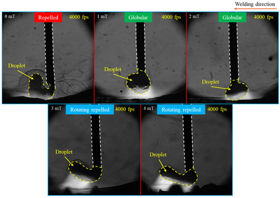Under an MFD of 2 mT, the centrifugal effect caused by the rotational motion of the molten metal inside the droplet is considered to keep the droplet position at the center, as shown in Figure 15. This centrifugal effect is thought to also cause the droplet to adopt an oval shape (teardrop shape). As shown in Figure 14, the calculated droplet temperature is higher than that for conventional CO2 arc welding, lowering the arc temperature around the center due to the stronger radiation loss by the denser metal vapor plasma that forms through evaporation from the droplet. The reduction in arc temperature lowers the current flow through the arc center due to a decrease in the electrical conductivity, decreasing the arc pressure directly under the droplet. Instead, a larger part of the current is considered to flow through the surrounding shielding gas plasma. The decrease in the arc pressure could be one of the factors preventing the transition to repelled transfer. According to these factors, the droplet could easily grow toward the welding pool rather than being repelled. Additionally, the high current density in this narrow upper part created a strong Lorentz force acting on the upper end of the droplet, forming a neck. As a result, the globular transfer occurred instead of the repelled transfer.