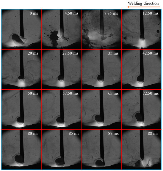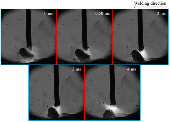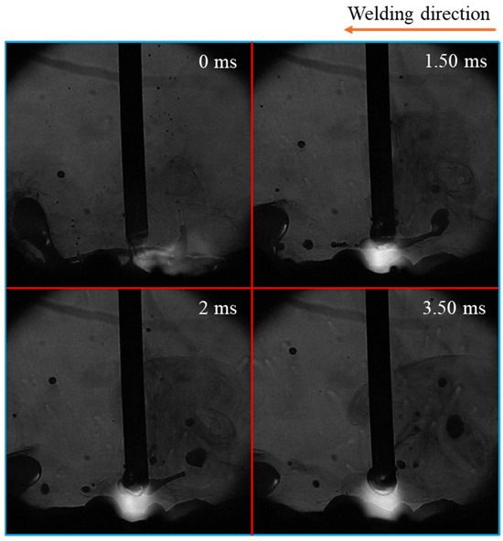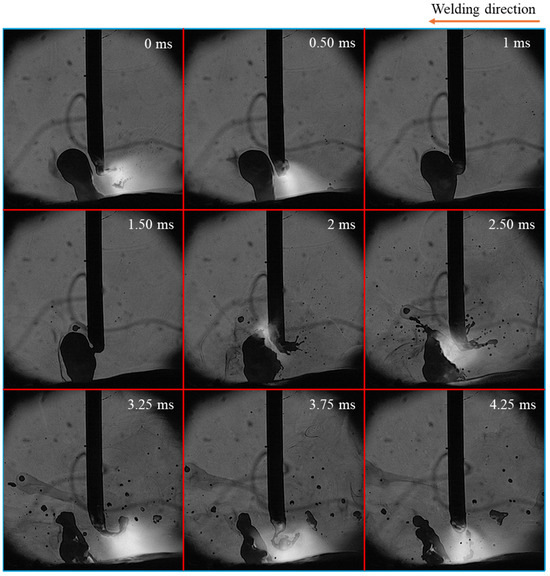 In the first stage (at 0 ms), the tail moved in the direction opposite to the droplet, leading to the formation and detachment of smaller droplets, which resulted in spattering. In the second stage, the tail moved back and touched the droplet (at 1 ms), causing an explosion (at 2 ms). This explosion produced numerous smaller droplets of varying sizes, which spattered in all directions. Larger molten metal droplets from the explosion—large spatters—also moved away from the weld pool (at 4.25 ms).