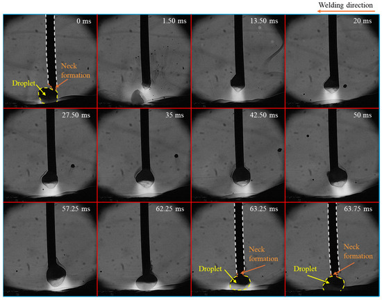 Time-sequential images of a droplet in one cycle of metal transfer in conventional CO2 arc welding.